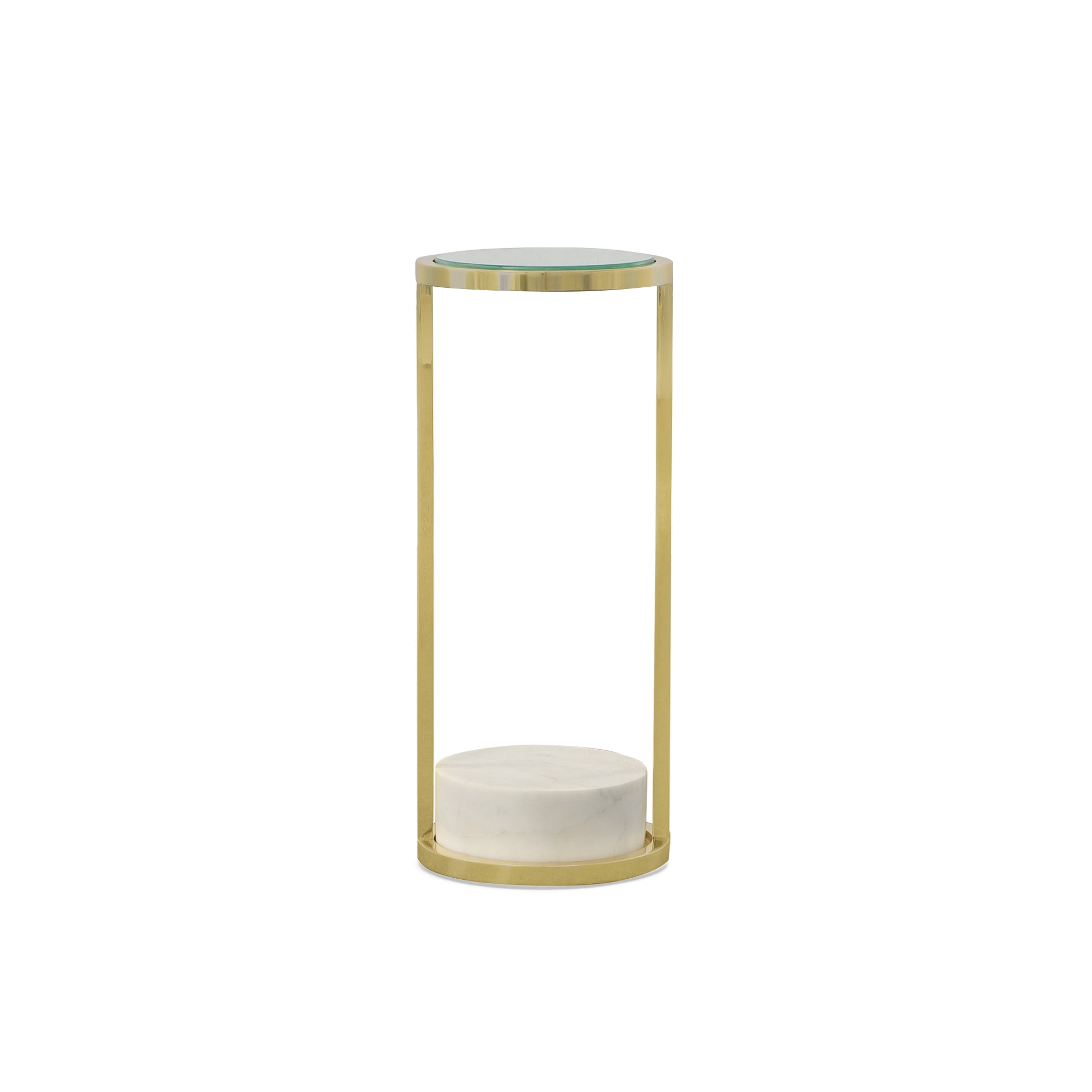 Polished brass metal frame with clear mirror top and white/grey marble base